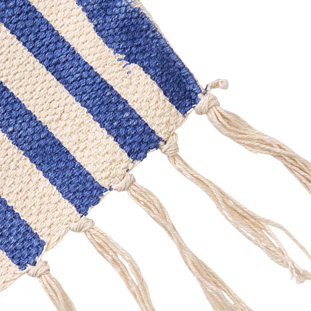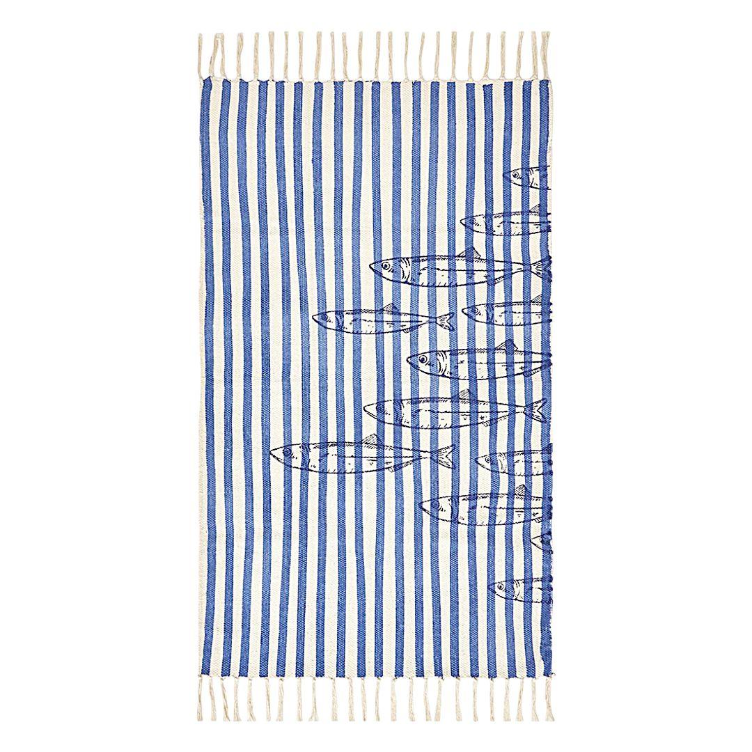 La alfombra de algodón Batela con rayas y peces combina un diseño marinero clásico con un formato práctico y decorativo. Sus rayas azules sobre fondo claro y el estampado de peces evocan el ambiente náutico, aportando frescura y personalidad a cualquier estancia.
