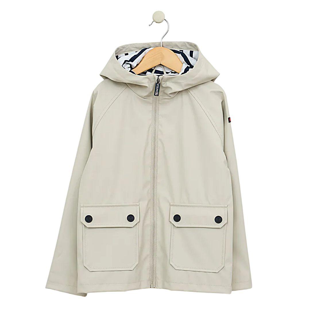 El chubasquero infantil impermeable de Batela es la prenda perfecta para mantener a los niños secos y cómodos en días lluviosos. Confeccionado en 100% poliuretano, garantiza una protección total contra el agua, mientras que su forro interior de algodón con estampado de rayas marineras aporta suavidad y estilo. Cuenta con capucha fija, bolsillos frontales con solapas y botones a presión decorados con anclas, y cierre de cremallera cubierto por una solapa adicional. Las mangas raglán ofrecen mayor libertad de movimiento.