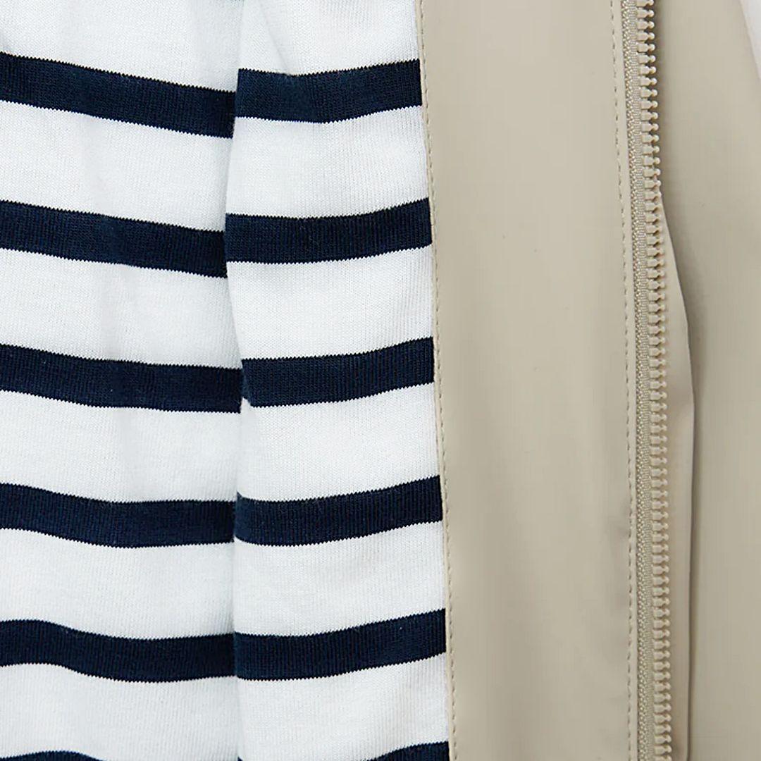 Este chubasquero no solo protege a los niños de la lluvia, sino que también les permite moverse libremente gracias a su diseño funcional. A diferencia de otros productos similares, el forro de algodón y los detalles marineros aportan un estilo único y una comodidad superior. Ideal para paseos, actividades escolares o cualquier aventura bajo la lluvia o como cortavientos, este chubasquero se convierte en una prenda esencial en el armario infantil.
