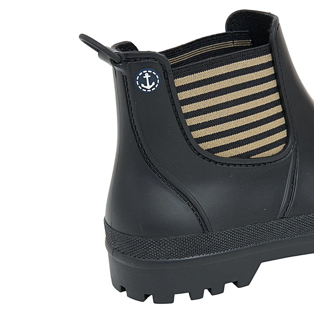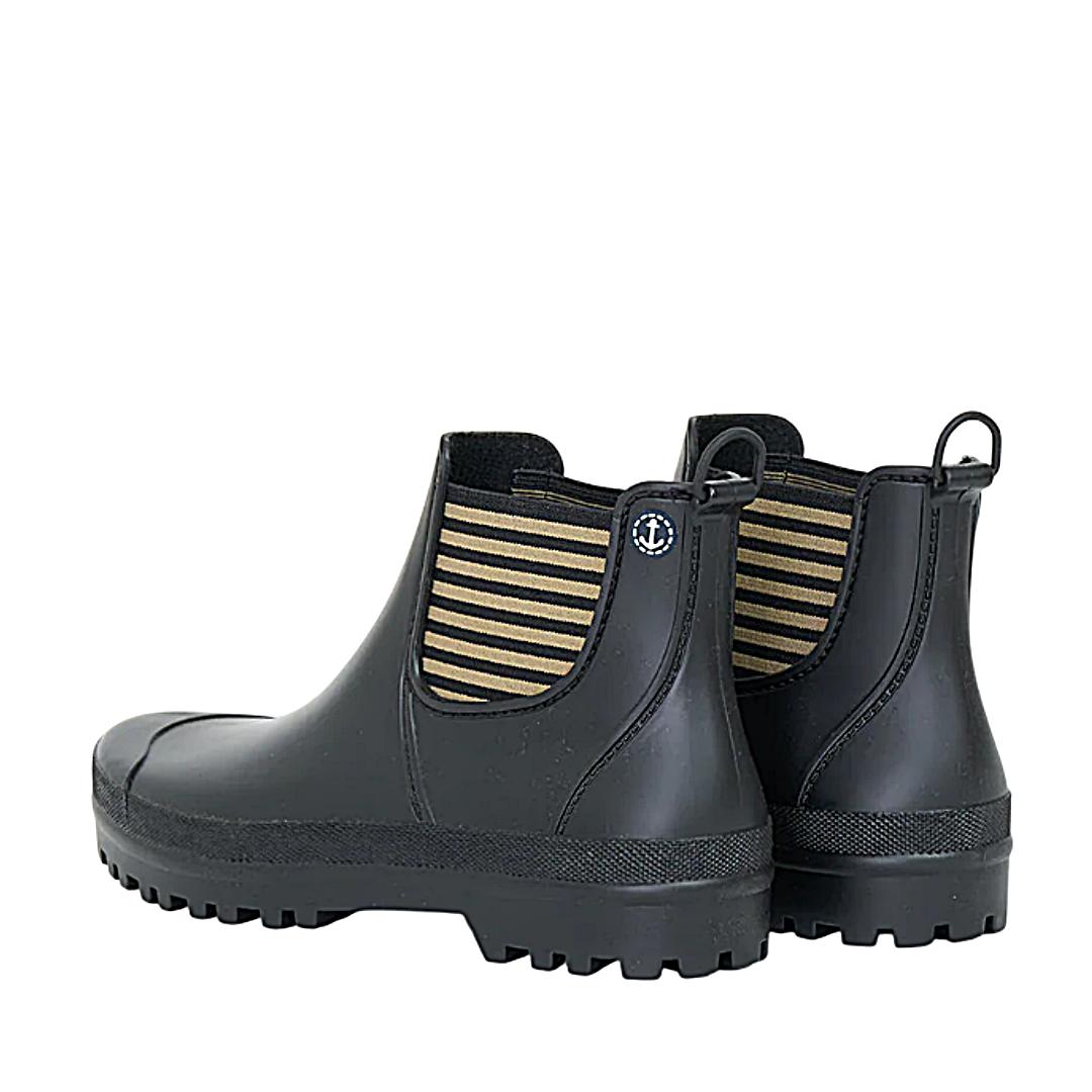 Bota katiuska mujer Batela en PVC impermeable. Diseño clásico negro, laterales elásticos a rayas y suela antideslizante. Durabilidad y estilo marinero.
