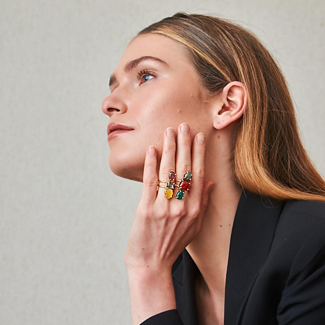 La pieza está elaborada en latón con baño de oro, un acabado que aporta luminosidad y durabilidad, y montada con piedras semipreciosas cuidadosamente seleccionadas por su color y forma. La disposición vertical de las piedras crea un efecto estilizado en la mano, resaltando la belleza natural de cada gema y aportando un toque sofisticado al look.