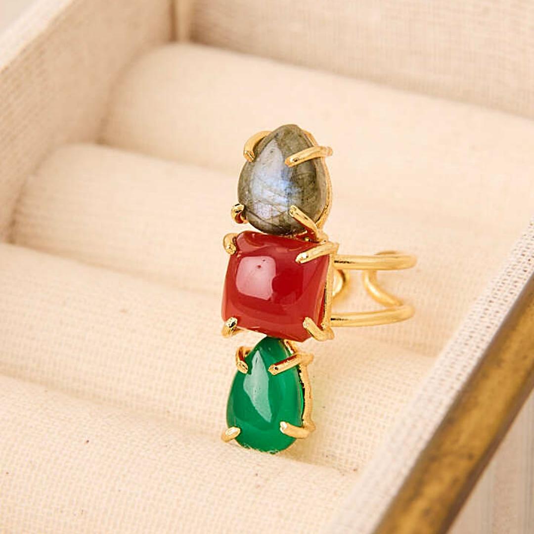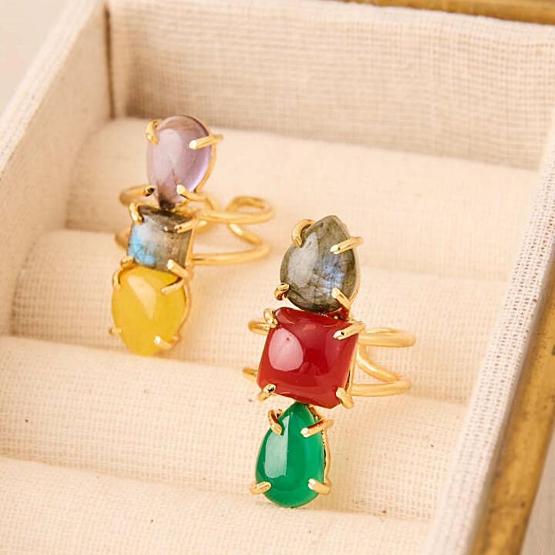 Anillo vertical de la firma Latido con tres piedras semipreciosas en colores vibrantes, montadas sobre latón con baño de oro. Diseño abierto, ajustable y sofisticado que estiliza la mano y destaca en cualquier ocasión.