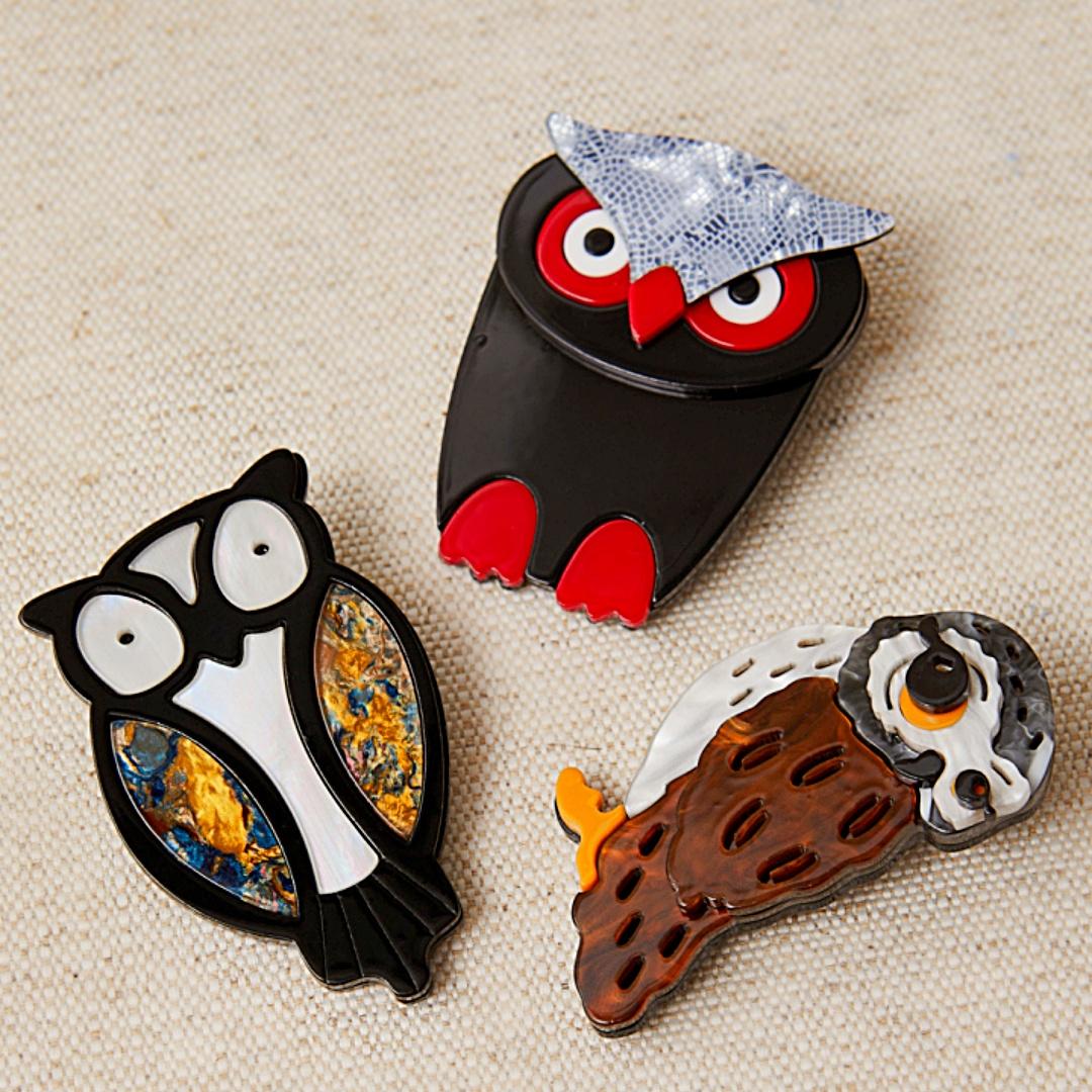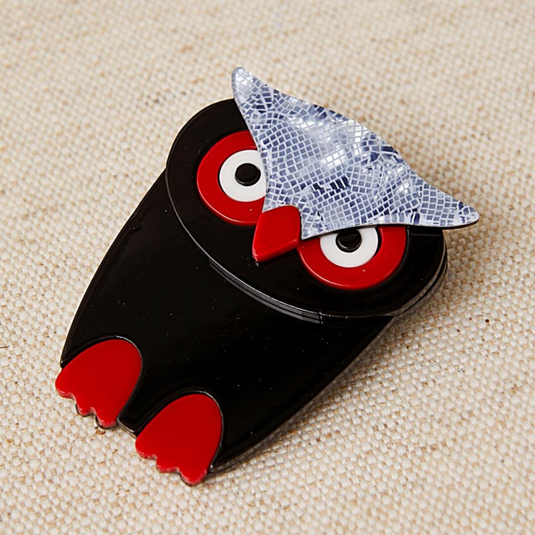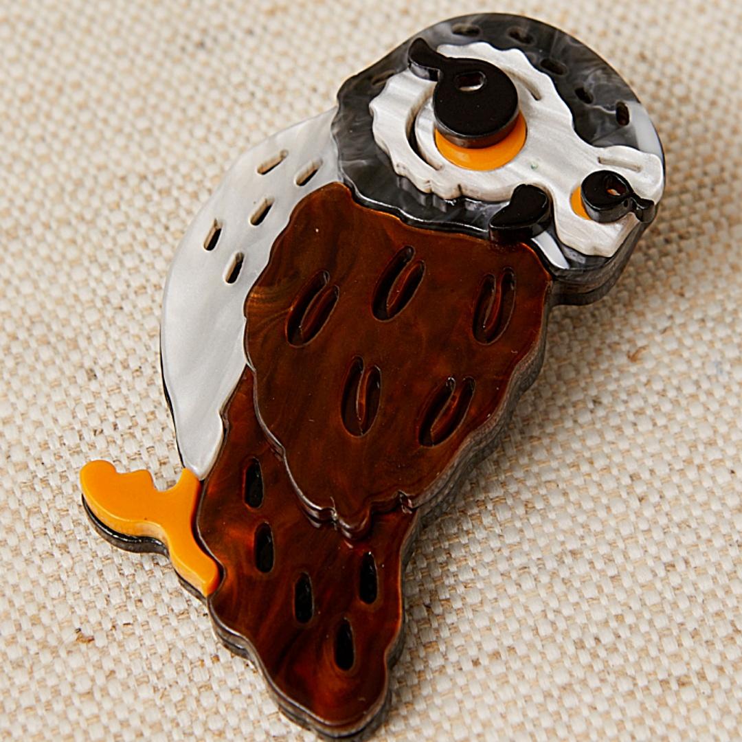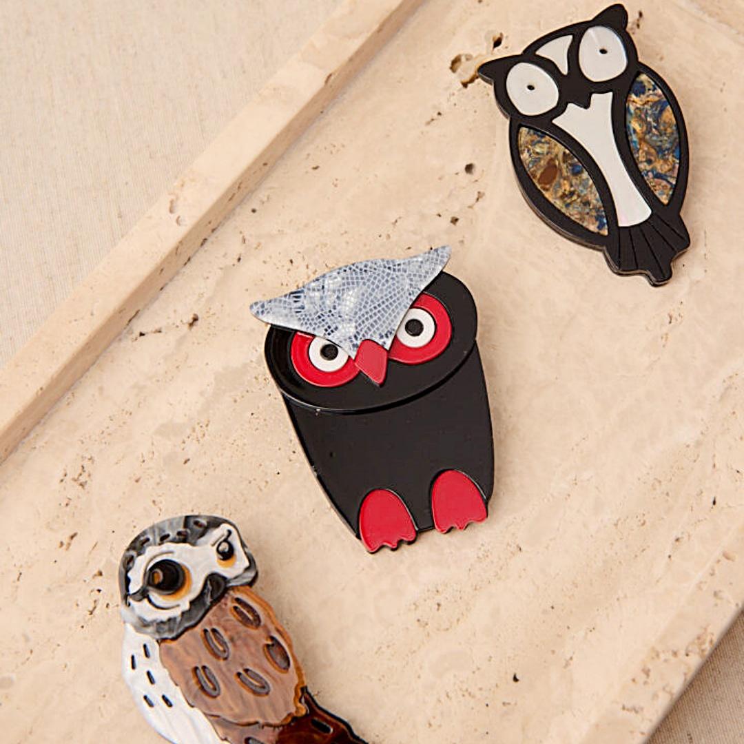 Broche de Latido en forma de búho, elaborado en acetato artesanal con acabado semi-nacarado y colores vibrantes. De 4 x 7 cm, combina textura, brillo y ligereza para dar un toque de originalidad y elegancia a cualquier prenda o accesorio.