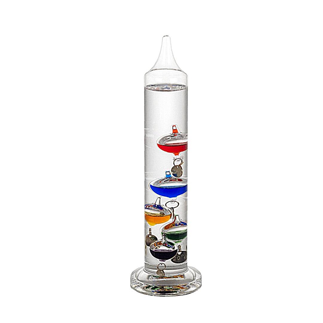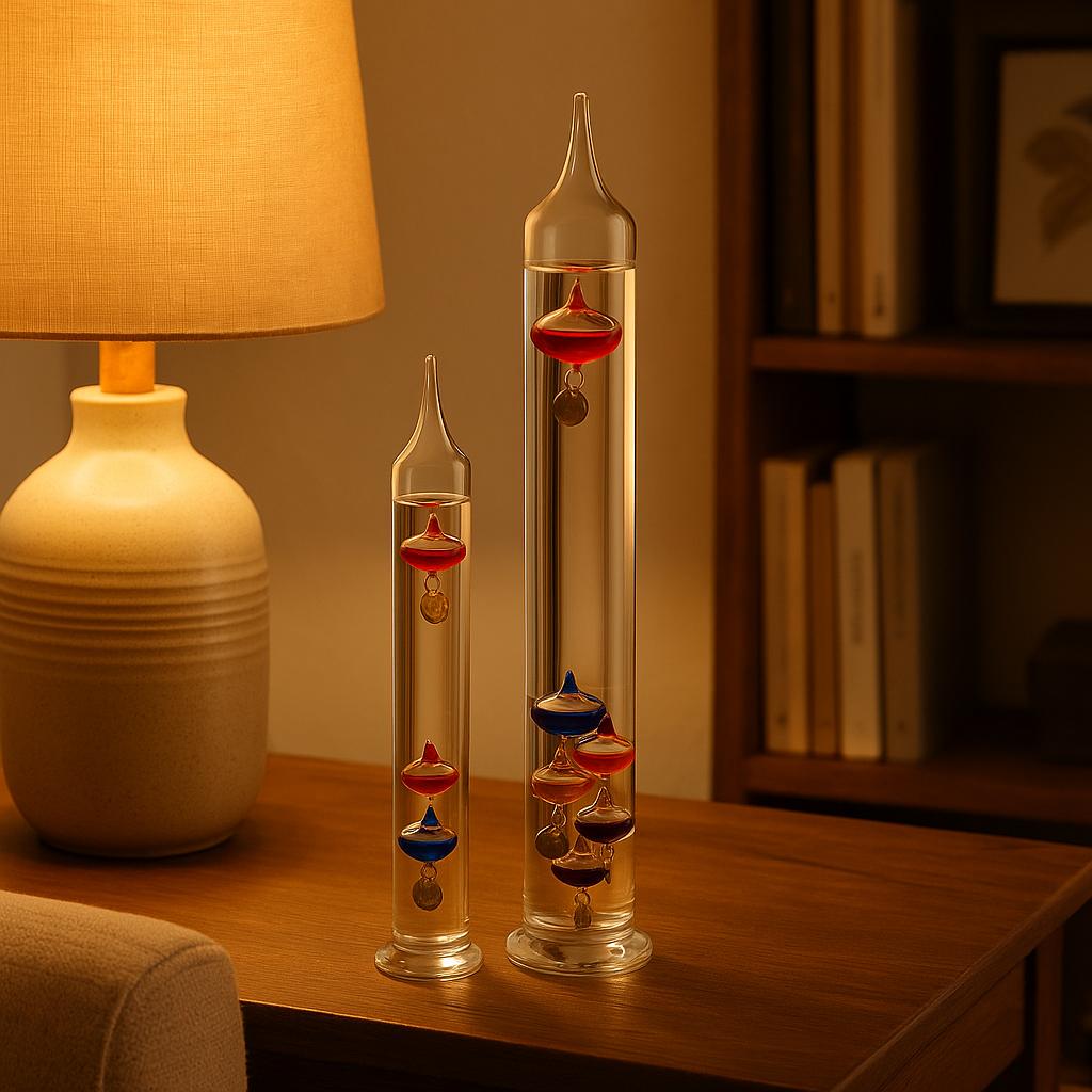 Inspirado en los experimentos del propio Galileo Galilei, este termómetro decorativo de vidrio combina ciencia, historia y diseño en una sola pieza. Su funcionamiento se basa en el principio de la densidad de los líquidos: dentro del cilindro de vidrio transparente, varias esferas de colores flotan o se hunden según la temperatura ambiente. Cada esfera está cuidadosamente sellada y lleva una pequeña placa metálica con el valor en grados correspondiente.