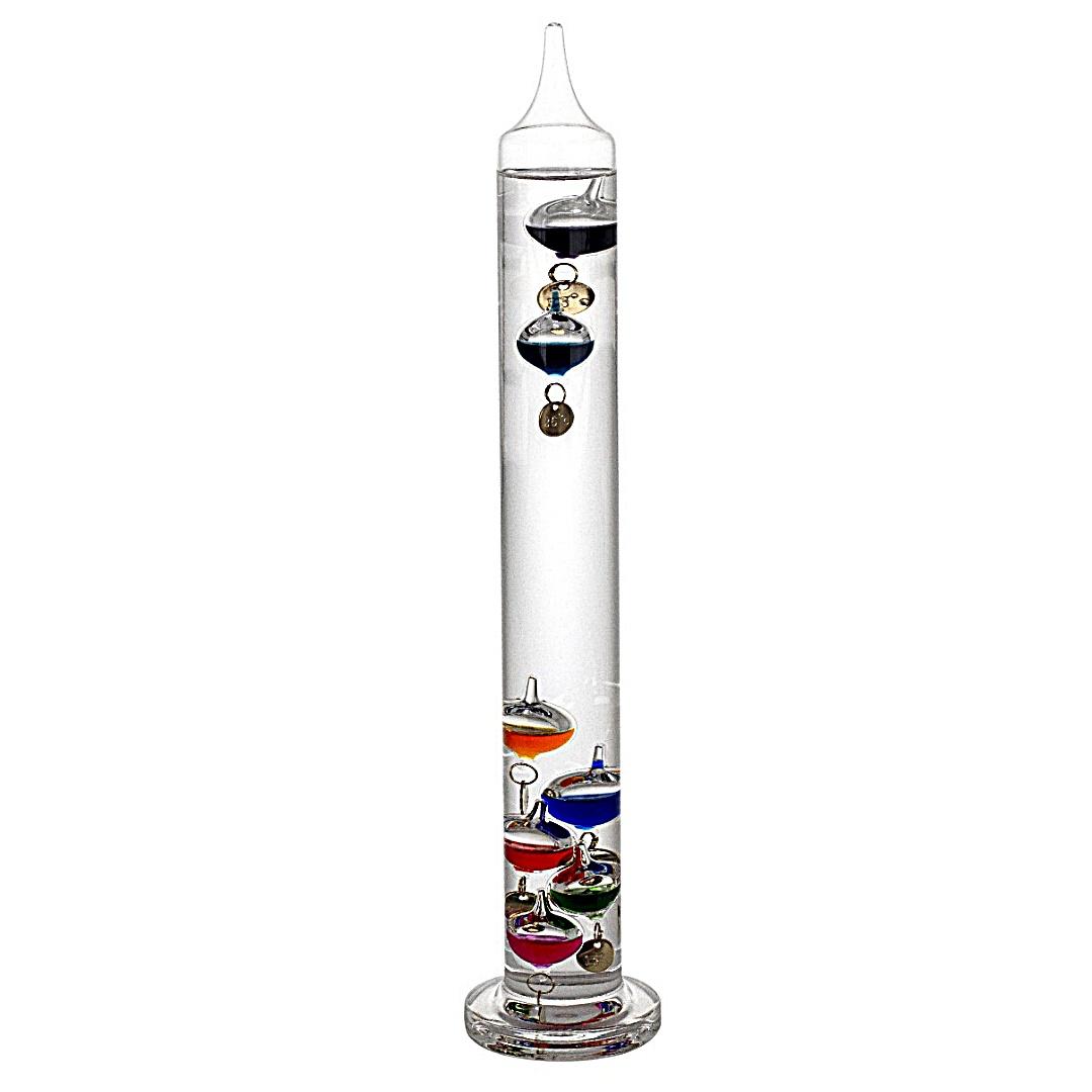 Termómetro Galileo de vidrio con esferas flotantes de colores. Mide la temperatura mediante la variación de densidad del líquido interior, combinando precisión y estética. Una pieza científica y decorativa, ideal como regalo original y curioso.