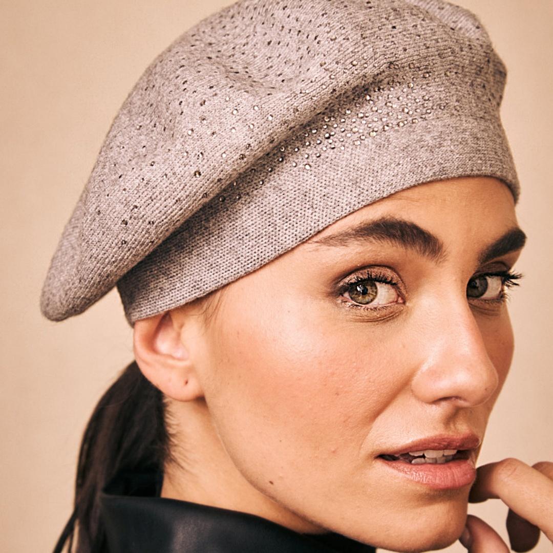 Boina de mujer de punto con cristales tipo zirconita que aportan brillo y elegancia. Disponible en beige, gris y negro, es el complemento perfecto para el invierno: cálida, ligera y con un estilo refinado que eleva cualquier look.