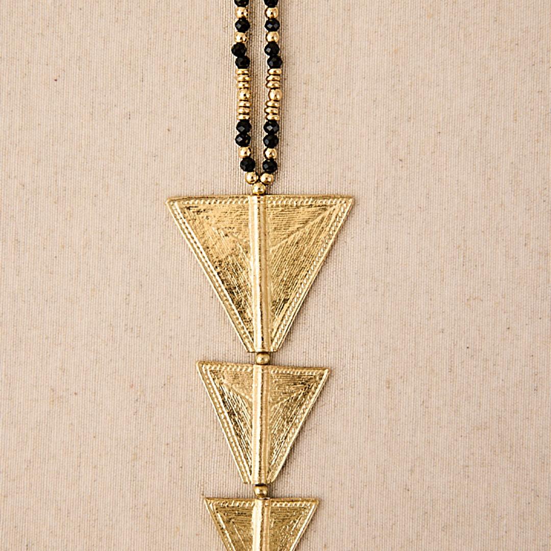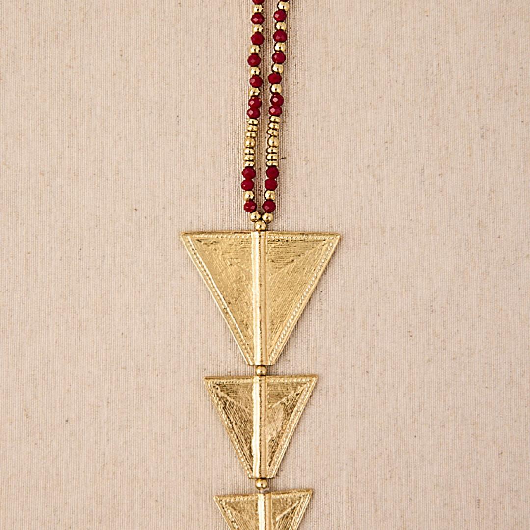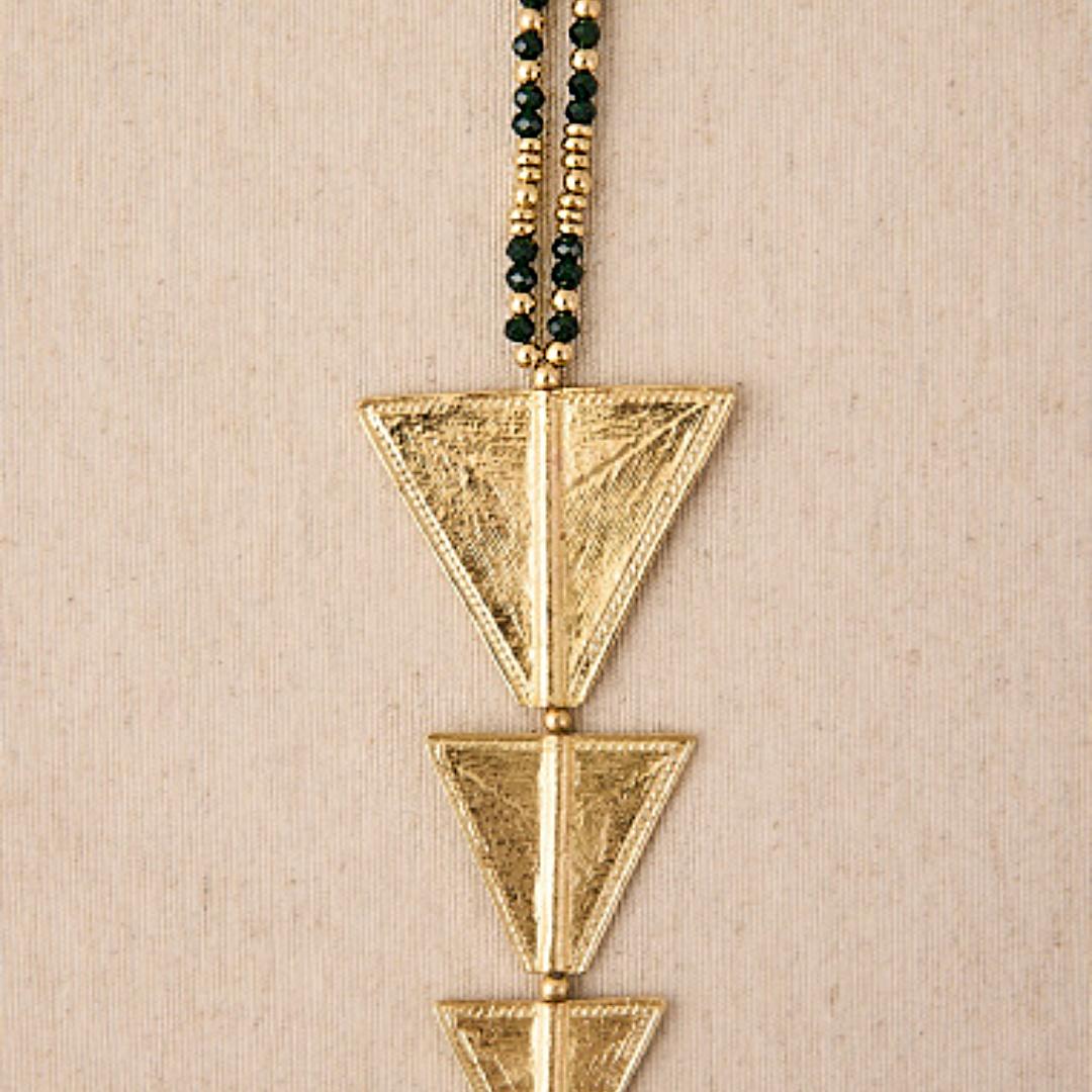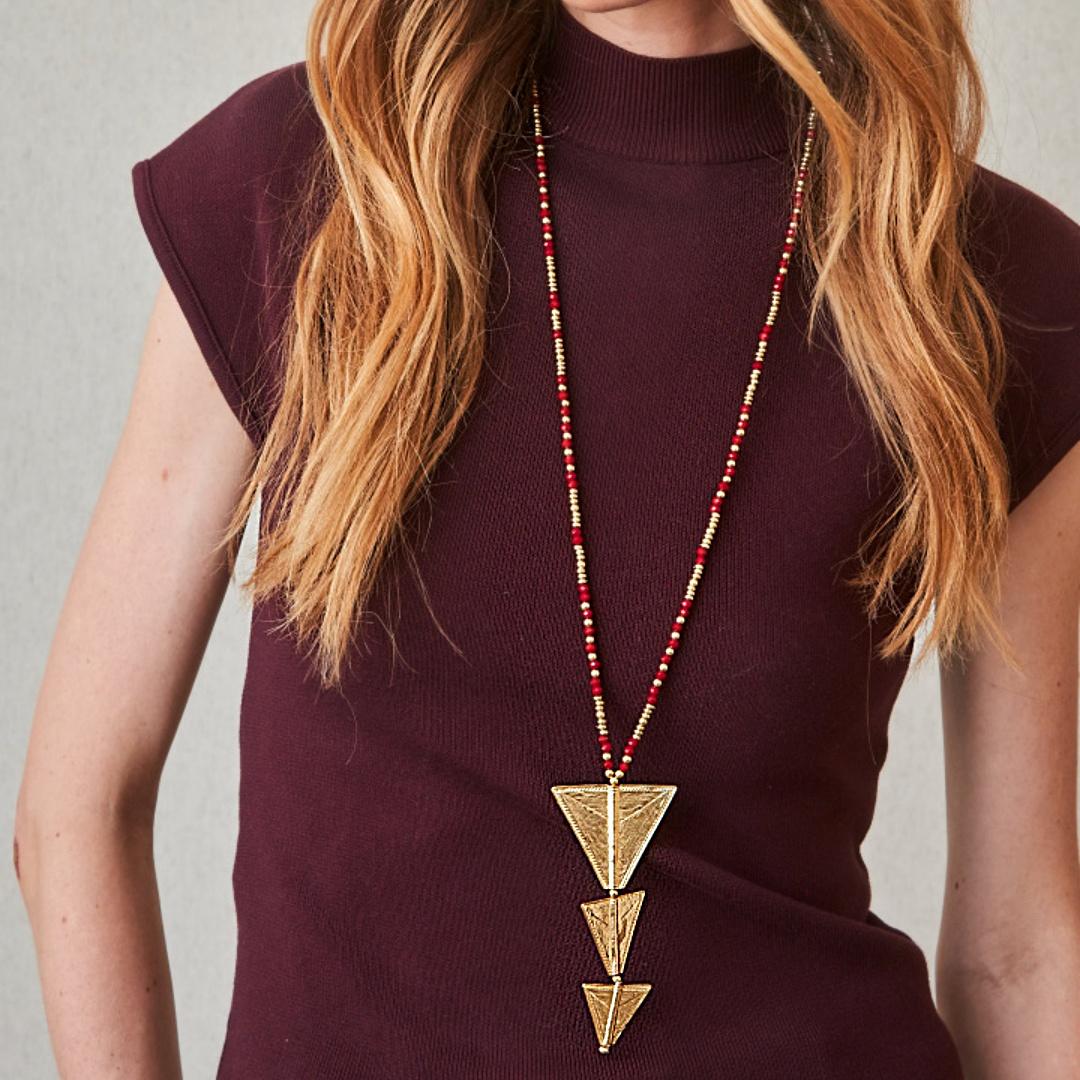 Collar largo de tres triángulos en latón con baño de oro, decorado con piedras en color verde, negro o granate. Con 52 cm de largo, es muy ligero y combina elegancia y diseño contemporáneo. Un collar dorado con piedras que realza cualquier conjunto.