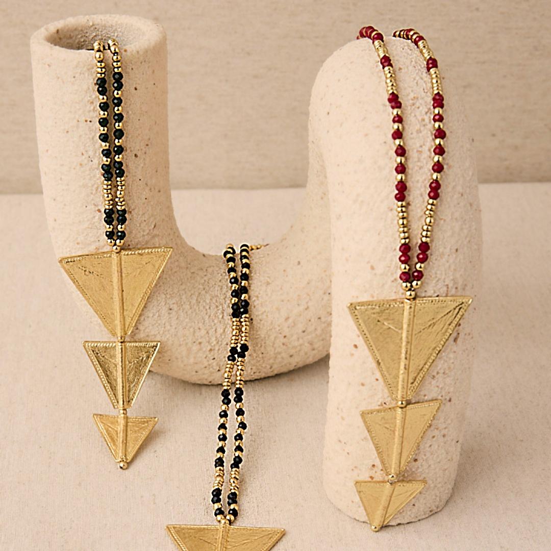 Este collar largo de triángulos en latón con piedras de color destaca por su diseño atrevido y elegante a la vez. Cada pieza triangular, trabajada en latón con baño de oro, aporta brillo y carácter, mientras que las cuentas de piedra en color verde, negro o granate introducen el contraste perfecto para un estilo con personalidad.