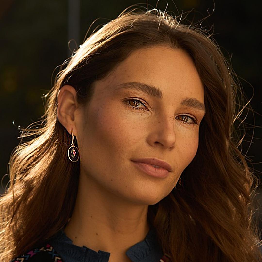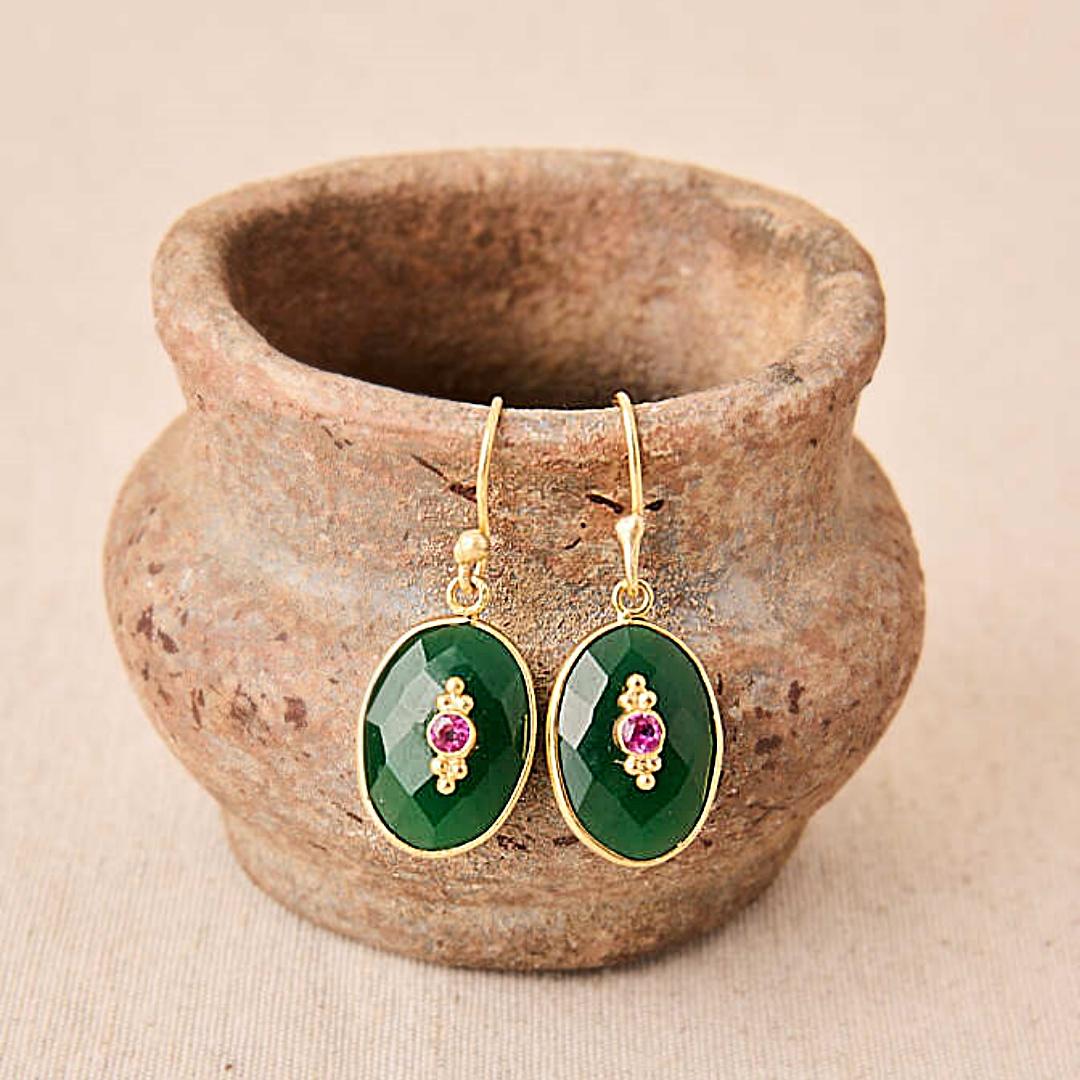 Pendientes de latón con baño de oro y piedra semipreciosa facetada. Diseño artesanal ovalado con detalle central en contraste y cierre de gancho.