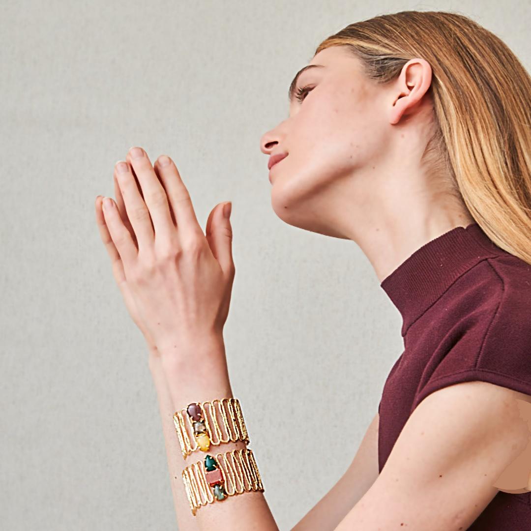 El brazalete Latido con baño de oro y piedras semipreciosas es una joya que combina elegancia, artesanía y luminosidad. Su diseño rígido y abierto, elaborado en latón con baño de oro, refleja la luz con un brillo cálido y natural, realzando la forma de la muñeca con delicadeza.