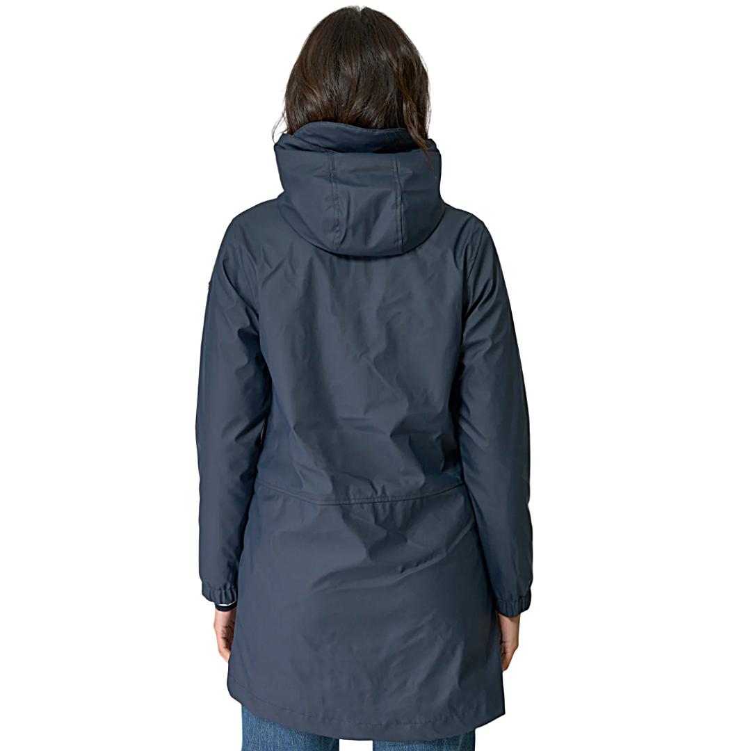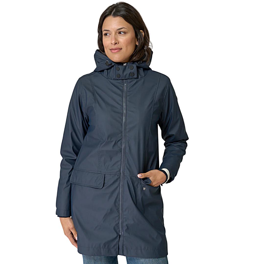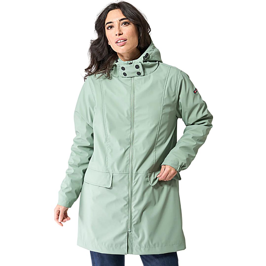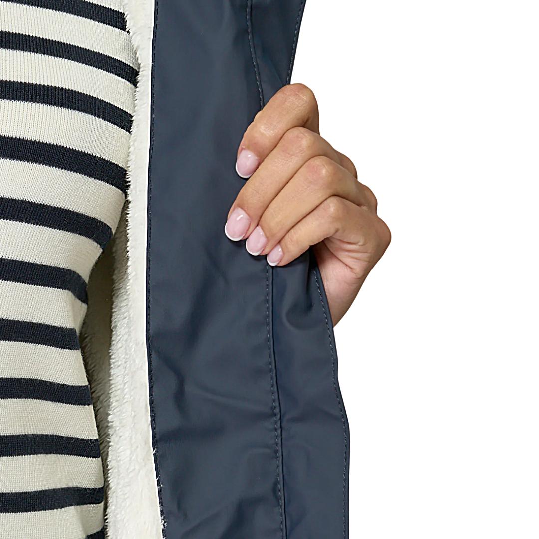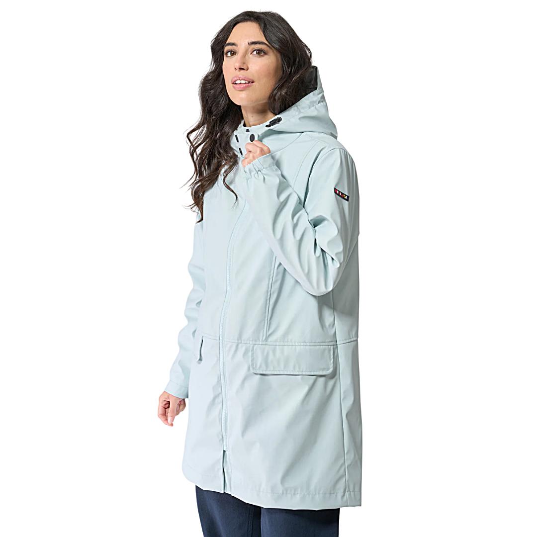 Chubasquero largo de mujer con forro polar interior, ideal para el invierno. Corte femenino, estilo limpio y tres colores disponibles: marino, verde agua y celeste. De la marca Batela.