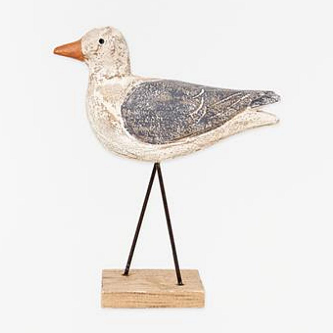 El cuerpo de la figura está trabajado en madera pintada en tonos blancos y grises, con un efecto envejecido que simula el paso del tiempo y añade personalidad sin caer en artificios. El pico largo en tono rojizo aporta contraste visual, mientras que la textura pincelada del plumaje sugiere movimiento, como si esta ave estuviera a punto de dar un paso en la arena húmeda. La base, de madera maciza, aporta estabilidad y un toque cálido que remata con coherencia el diseño general de la pieza.