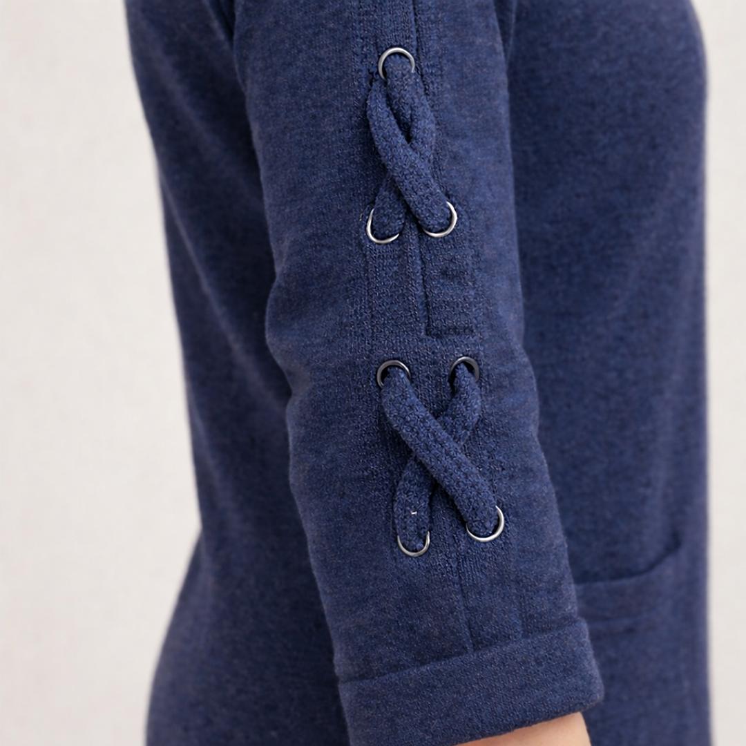 Vestido de mujer Batela en algodón grueso, muy cálido y pensado para la temporada de invierno. Modelo de corte ajustado, manga larga y color marino, con detalle característico de cuerdas decorativas en las mangas. Talla pequeño y marca la silueta, por lo que no es una prenda holgada.