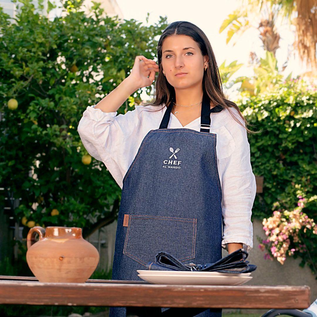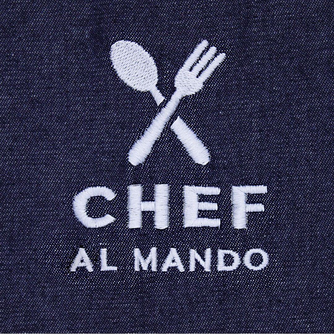 Delantal vaquero para adulto en tejido 100% algodón, con bordado blanco “Chef al mando”. Ajustable, cómodo y perfecto para compartir cocina en familia. Incluye guía de medidas en la descripción completa.