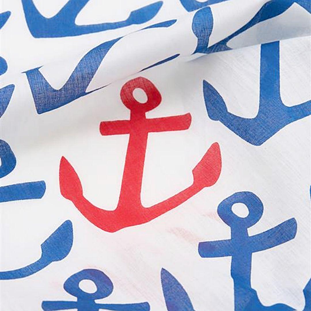 El diseño destaca por su estampado de anclas en tonos azules y rojos sobre fondo claro, un motivo clásico del universo náutico que transmite de forma inmediata el espíritu marinero de Batela. Este patrón se combina con detalles de rayas decorativas en uno de los extremos del foulard, aportando contraste y dinamismo al conjunto. El resultado es un complemento equilibrado, fresco y muy fácil de combinar con prendas básicas, camisetas, camisas o vestidos. Su diseño aporta personalidad sin resultar excesivo, lo que permite integrarlo con naturalidad en diferentes estilos de vestuario.