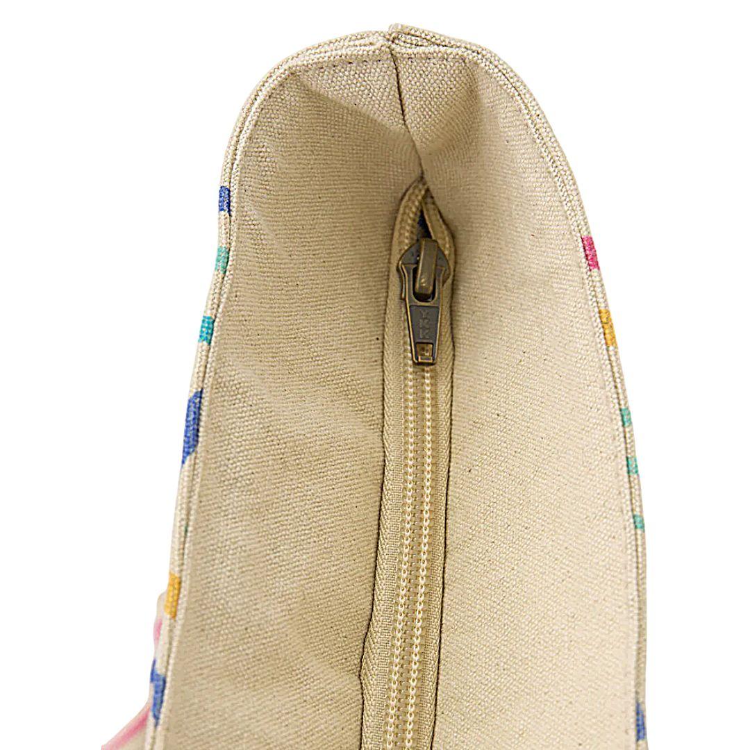 Las asas largas y resistentes permiten llevarla cómodamente al hombro, proporcionando estabilidad incluso cuando la bolsa va cargada. Además, el cierre superior con cremallera añade un plus de seguridad, permitiendo guardar objetos personales con tranquilidad. El tejido de la bolsa presenta una textura natural y resistente que combina funcionalidad con un estilo desenfadado. Su estructura amplia facilita el acceso al interior y permite transportar desde ropa o toallas hasta libros, compras o accesorios de uso diario. El resultado es una bolsa versátil, ligera y con mucha personalidad, pensada para acompañar tanto en planes cotidianos como en escapadas junto al mar.