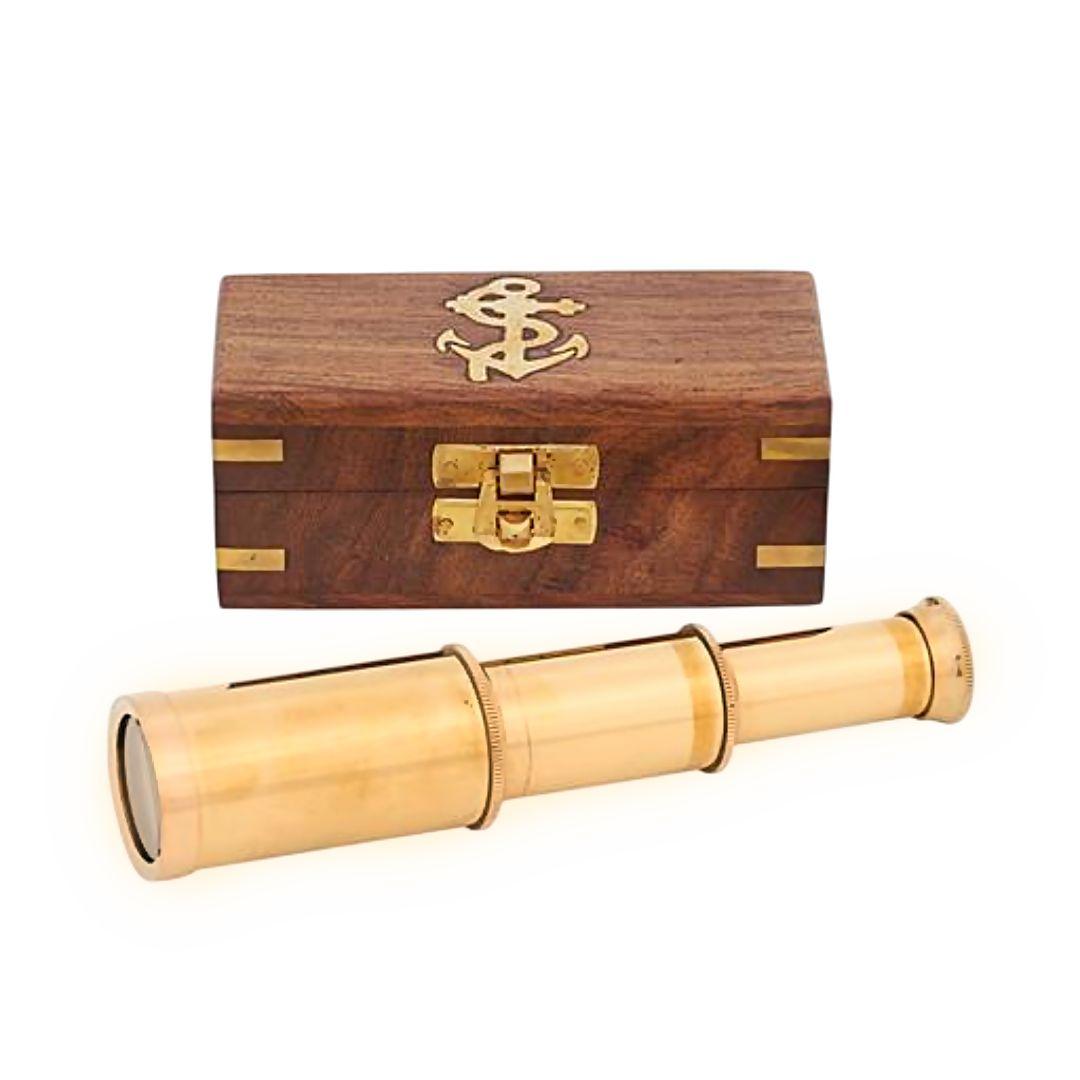 Elegante telescopio de latón Batela de 17 cm, inspirado en los instrumentos clásicos de navegación. Se presenta acompañado de un cuidado estuche de madera con cantoneras de latón y ancla decorativa en la tapa, lo que lo convierte en una pieza perfecta de decoración marinera o en un regalo original para amantes del mar.