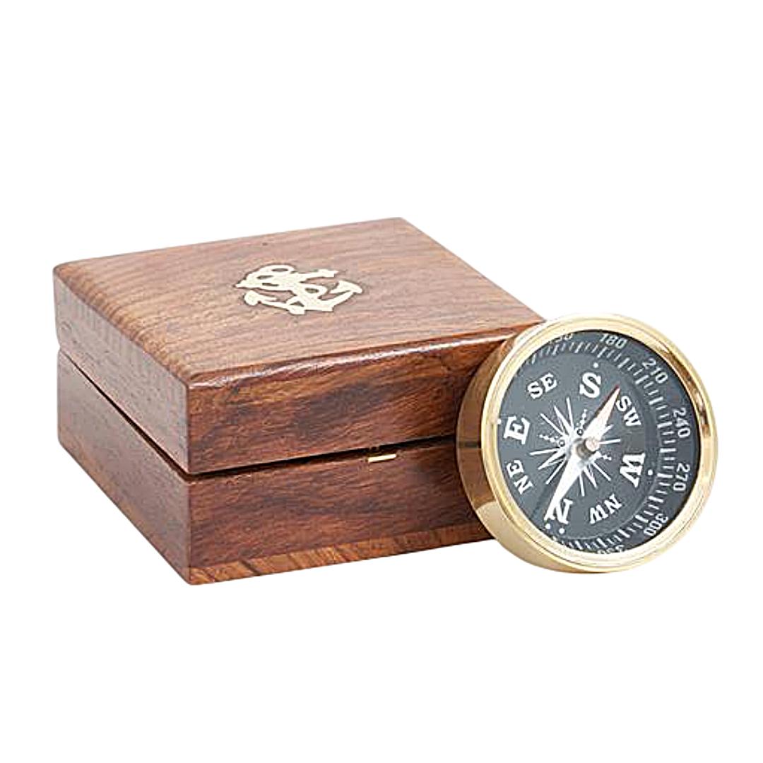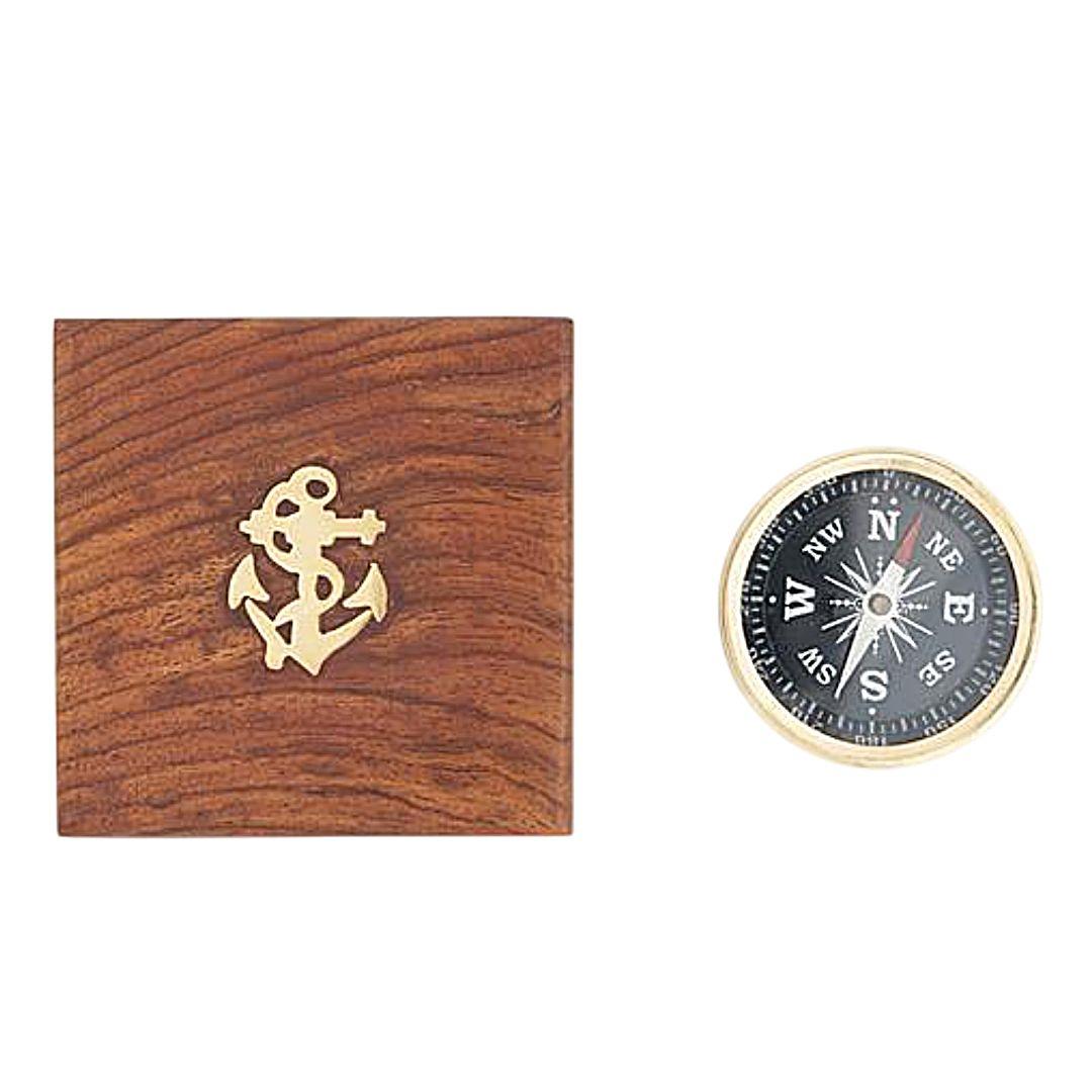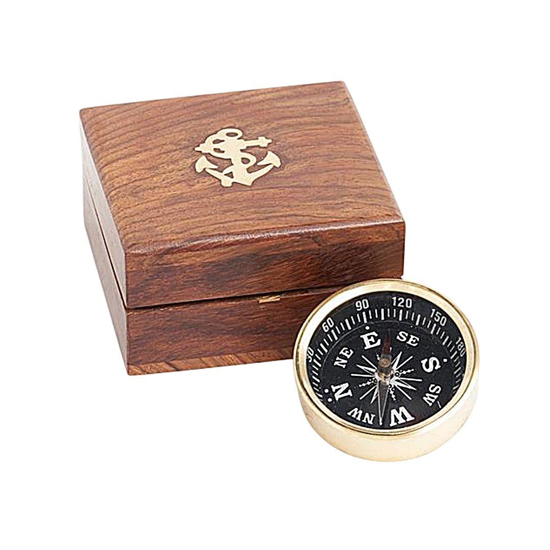 La brújula tiene un diámetro de 5 cm, un tamaño compacto que la hace especialmente atractiva como objeto decorativo o como pieza de colección. Su diseño muestra la clásica rosa de los vientos con las principales direcciones marcadas con claridad, evocando los instrumentos que durante generaciones ayudaron a orientarse a navegantes y exploradores. El conjunto se completa con un cuidado estuche de madera, que aporta aún más personalidad a la pieza. La caja presenta un bonito acabado natural y está decorada en la tapa con una ancla de latón, un detalle que refuerza su estética marinera. El estuche protege la brújula y, al mismo tiempo, convierte el conjunto en un objeto muy atractivo para exhibir en una estantería, escritorio o vitrina.