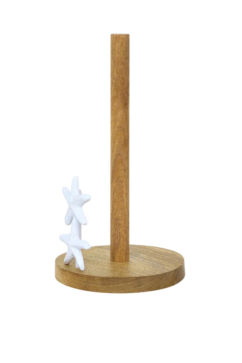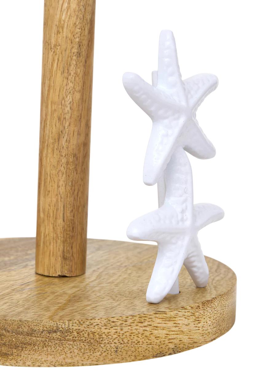 Su estructura combina madera natural y hierro, creando un contraste cálido y equilibrado entre materiales. La base redonda de madera aporta estabilidad, mientras que el soporte vertical permite colocar cómodamente el rollo de papel de cocina. En el frontal, dos delicadas estrellas de mar en color blanco aportan un detalle decorativo que refuerza su estilo marinero.