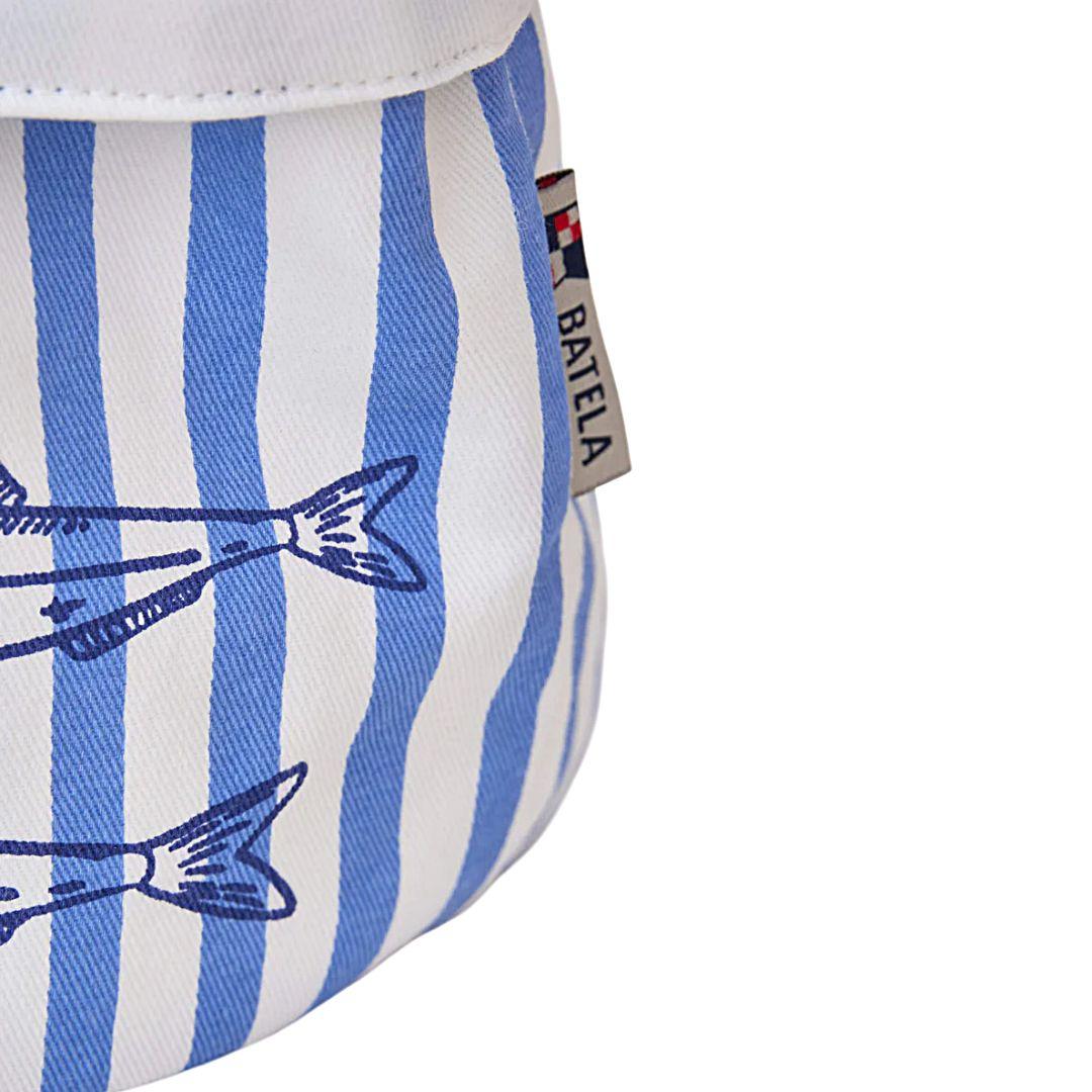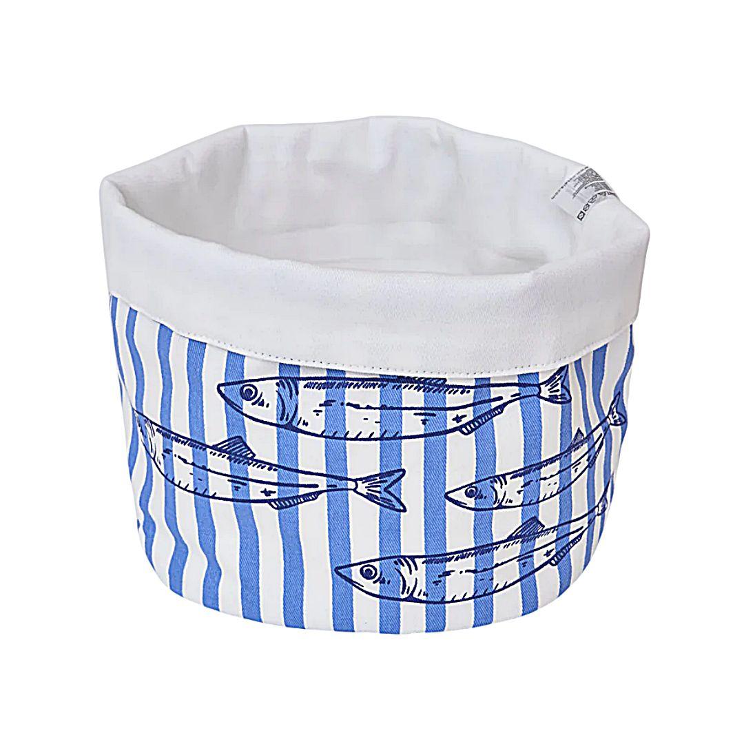 La cesta de pan náutica Batela es un accesorio práctico y decorativo que aporta un toque marinero a la mesa o a la cocina. Confeccionada en algodón con estampado de peces sobre rayas azules, combina funcionalidad y estilo para presentar pan, bollería o pequeños textiles.