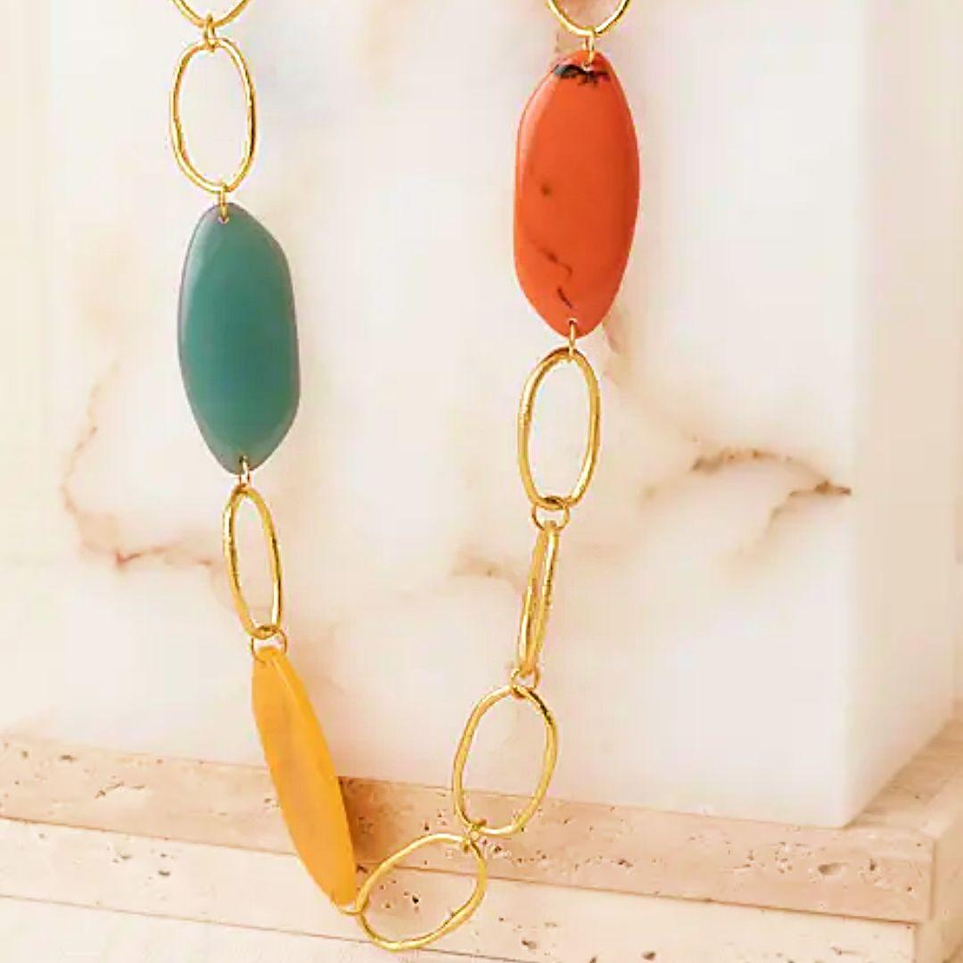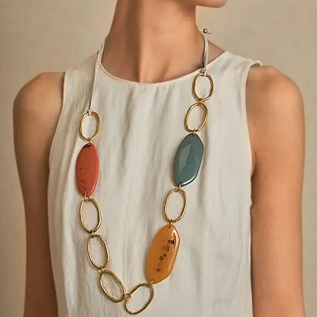 El collar largo Latido de eslabones dorados y piezas en color es una pieza con presencia, diseñada para estilizar la silueta y aportar un toque contemporáneo. Su combinación de formas orgánicas y tonos vibrantes lo convierte en un complemento muy especial.