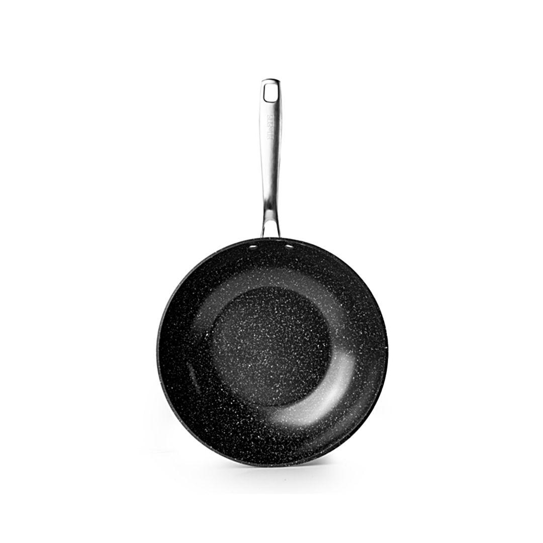 El mango de acero inoxidable no solo aporta solidez, sino que permite introducir la sartén en el horno hasta 230 °C. Esto amplía mucho sus posibilidades: desde terminar carnes al horno hasta preparar recetas más elaboradas sin cambiar de recipiente. El fondo Full Induction optimiza el contacto con la fuente de calor, mejorando la eficiencia energética y asegurando un rendimiento óptimo en todo tipo de cocinas: inducción, vitrocerámica, gas y eléctricas. Su acabado efecto piedra aporta un diseño actual, sobrio y elegante, pero sin caer en lo superficial: aquí lo importante es cómo funciona.
