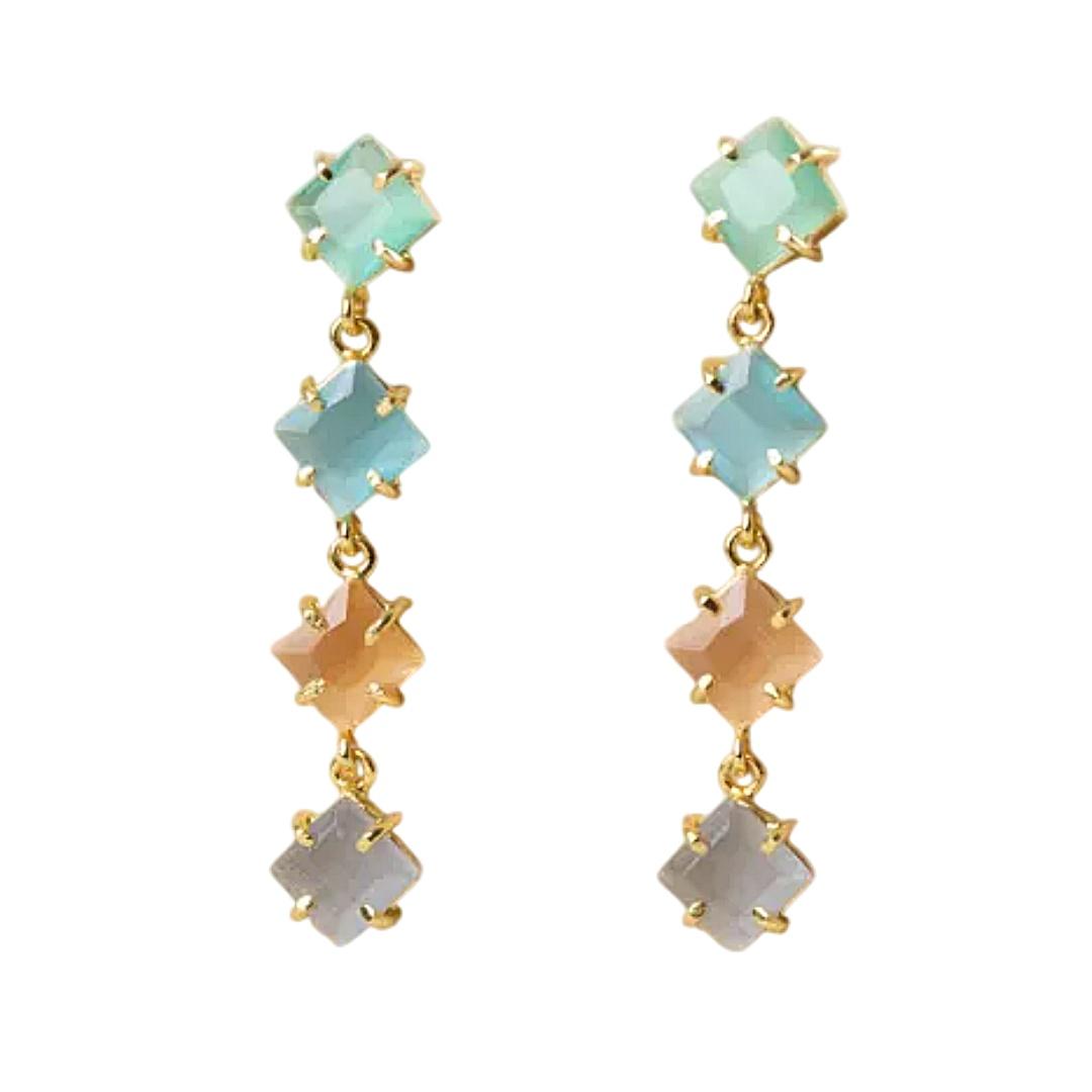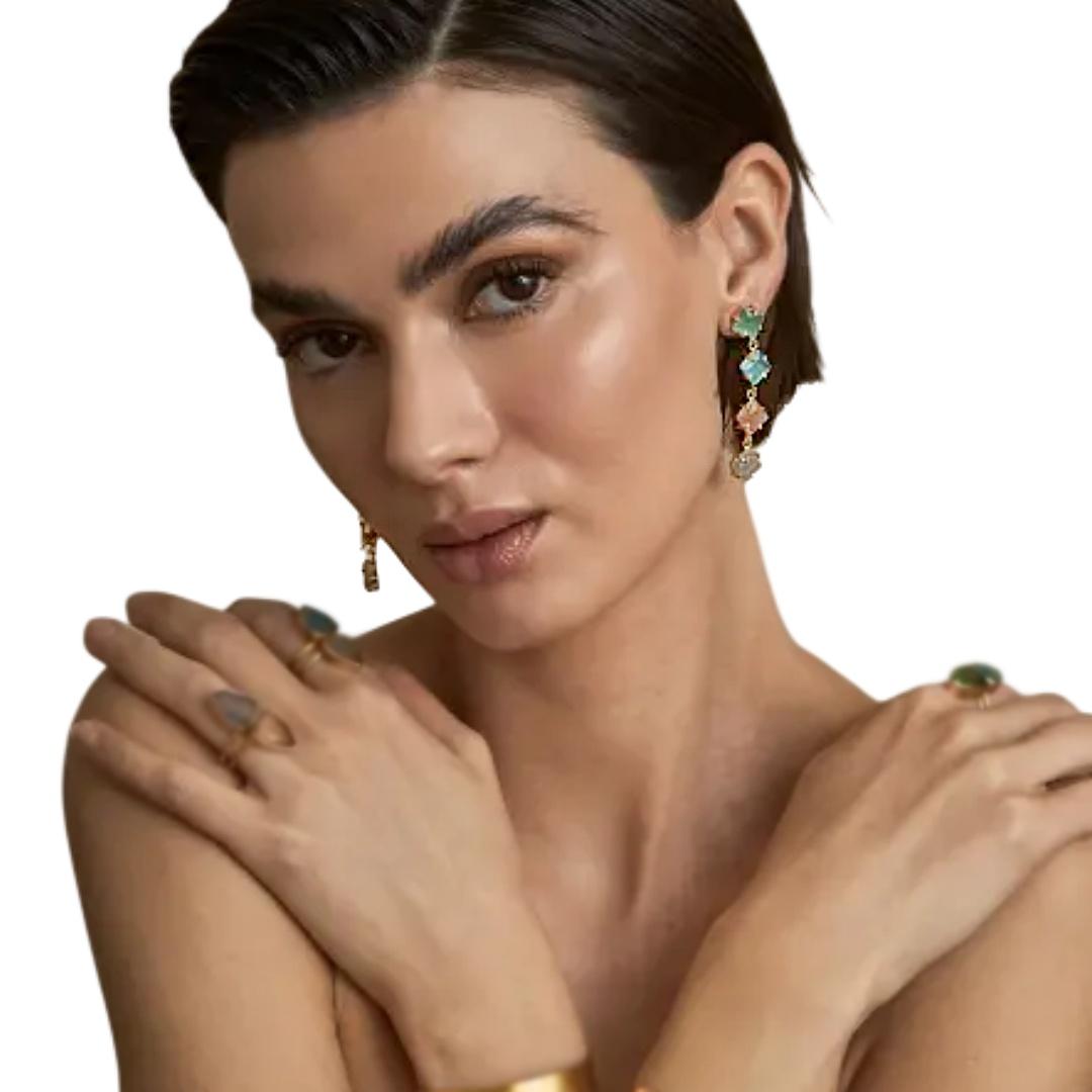 Los pendientes largos con piedras semipreciosas de Latido están pensados para quienes buscan un complemento con presencia. Su diseño vertical, formado por varias piezas geométricas engarzadas, crea un efecto visual dinámico que estiliza el rostro y aporta movimiento. Cada piedra introduce un matiz de color diferente, dando lugar a una composición equilibrada y muy atractiva. El acabado en latón con baño de oro refuerza la luminosidad del conjunto y aporta ese toque sofisticado que eleva cualquier look, desde los más sencillos hasta los más cuidados.