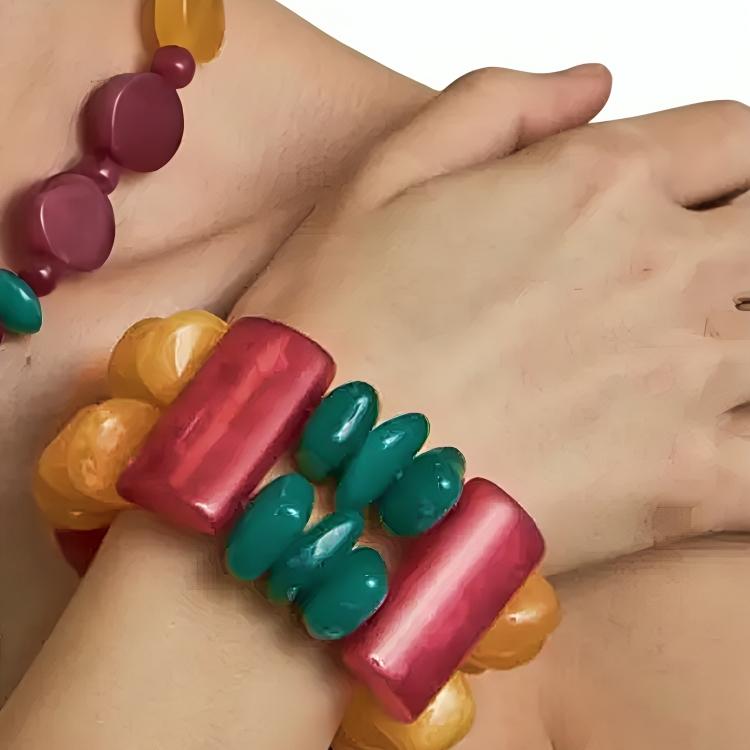 Lo que realmente define esta pulsera es su combinación de colores intensos y contrastes bien trabajados. Cada tono aporta fuerza sin competir con el resto, logrando un equilibrio que hace que la pieza resulte llamativa, pero fácil de integrar en distintos estilos. El resultado es un complemento con personalidad, capaz de transformar un conjunto sencillo en algo mucho más interesante. Su estructura rígida pero adaptable permite colocarla con facilidad, ofreciendo comodidad sin perder firmeza. A pesar de su volumen, es una pulsera ligera, pensada para acompañar durante todo el día sin resultar incómoda. Este equilibrio entre tamaño, color y ligereza es lo que la convierte en una pieza tan versátil. Funciona especialmente bien en looks de verano, estilismos relajados o combinaciones más atrevidas donde el color tiene protagonismo. También puede llevarse como pieza única o combinada con otras pulseras para un efecto más marcado.