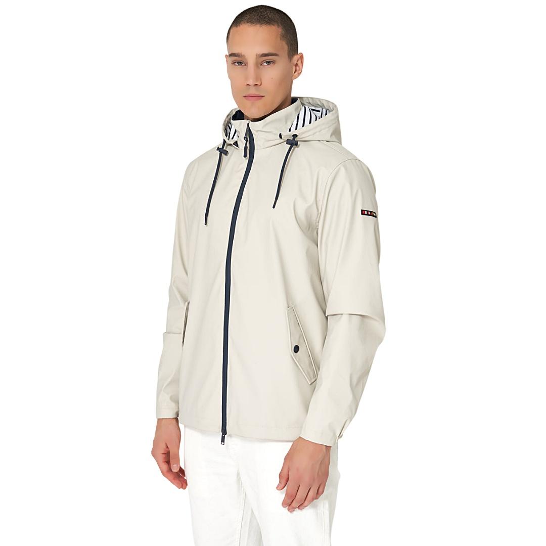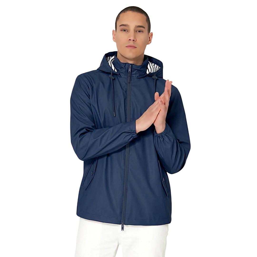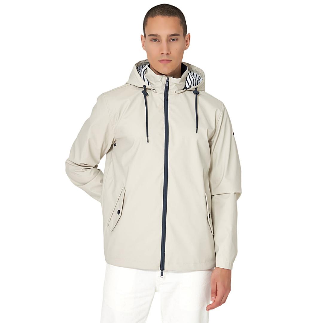 Chubasquero Batela hombre impermeable con forro de algodón a rayas. Disponible en color marino y moonstruck, un tono suave entre gris verdoso y beige. Ligero, cómodo y perfecto para el día a día.