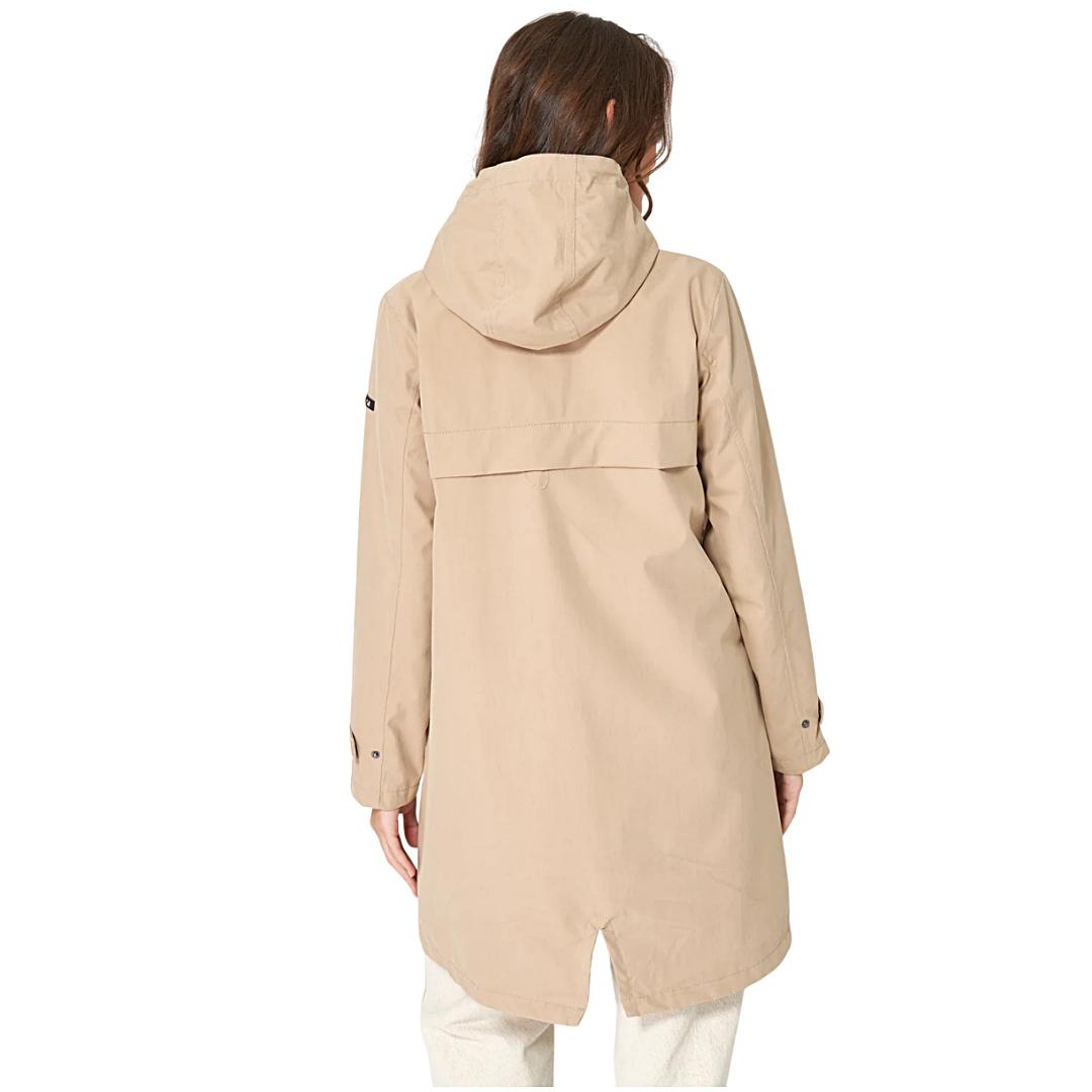 Chaqueta impermeable larga Batela mujer en algodón con acabado natural. Ligera, cómoda y con mayor cobertura, perfecta para lluvia y entretiempo.