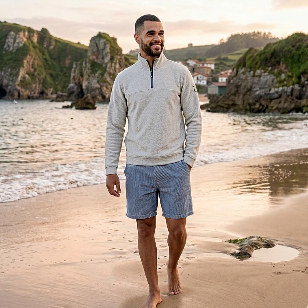La sudadera de hombre Batela con media cremallera es una de esas prendas que, en cuanto la tienes en la mano, se nota que está un paso por encima. Aquí no todo es diseño: el verdadero valor está en el tejido y en cómo responde con el uso. Está confeccionada en punto interlock, un tejido de doble estructura mucho más consistente que el punto convencional. Esto se traduce en una prenda con más cuerpo, mejor caída y una sensación de calidad que se mantiene con el tiempo. No se deforma con facilidad, no pierde su forma y ofrece un tacto suave pero firme, de esos que transmiten durabilidad desde el primer momento. La composición de 95% algodón y 5% spandex aporta el equilibrio justo entre naturalidad y elasticidad. El algodón garantiza transpirabilidad y confort, mientras que el pequeño porcentaje de elastano mejora la adaptación al cuerpo y permite que la prenda recupere su forma tras cada uso.