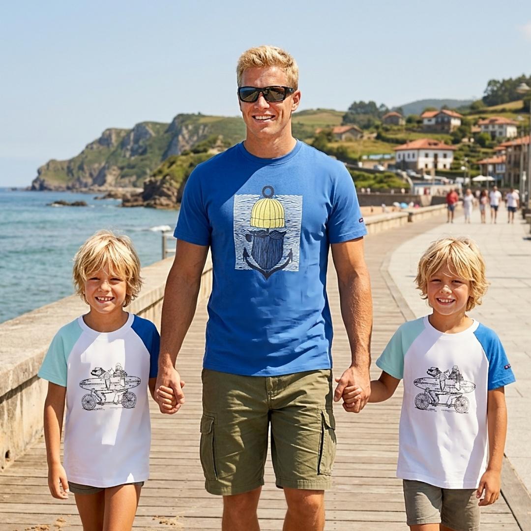 Esta camiseta infantil Batela combina un diseño diferente con la comodidad de una prenda pensada para el día a día. Su estilo destaca por las mangas raglán en contraste, que aportan un toque más dinámico y actual sin perder la esencia marinera de la marca. El cuerpo en color blanco sirve de base para el estampado frontal, una ilustración con escena de surf que aporta carácter y un aire desenfadado. Es un diseño original, fácil de reconocer y con ese punto divertido que suele enganchar a los más pequeños.