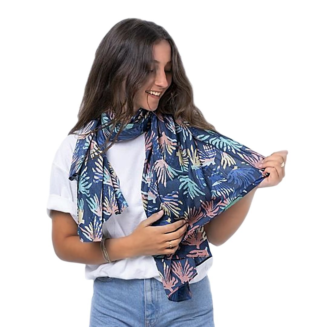El foulard algas fondo marino Batela A2402 es un complemento ligero confeccionado en algodón suave, con un diseño inspirado en el mundo marino. Su fondo azul y el estampado de algas multicolor aportan un aire fresco y natural, fácil de combinar con diferentes estilos.